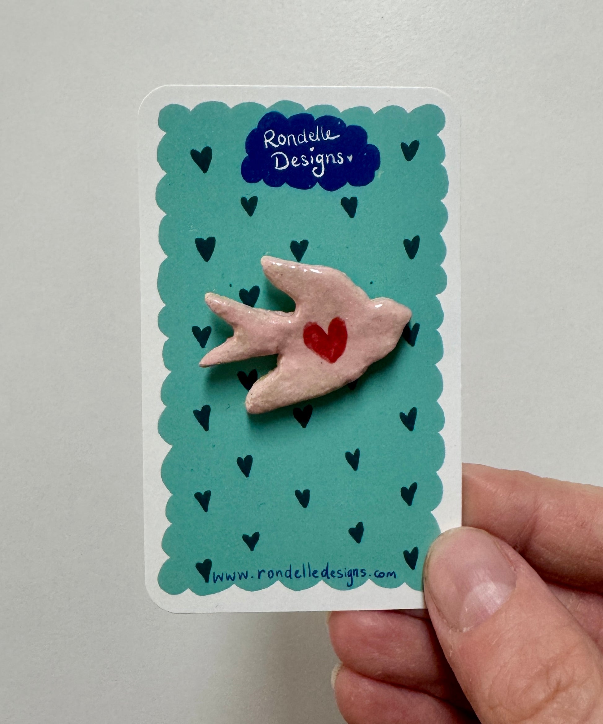 Ceramic Brooch - Bird - Pink with Red Heart