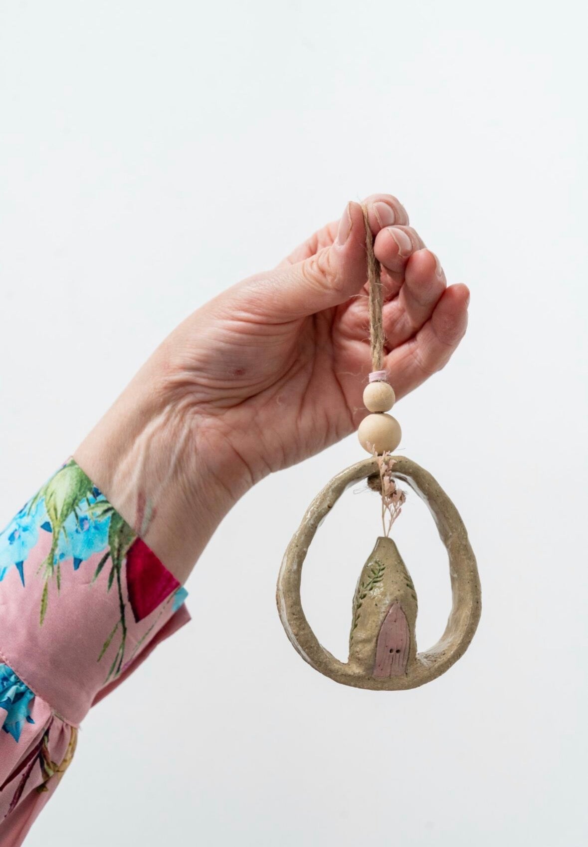 This lovely delicate handbuilt ceramic wall hanging features the cutest fairy house with pink door. This wall hanging looks lovely in a cluster of wall art or by itself on a thin wall space. Also features a hole for a little flower or foliage. Flower included