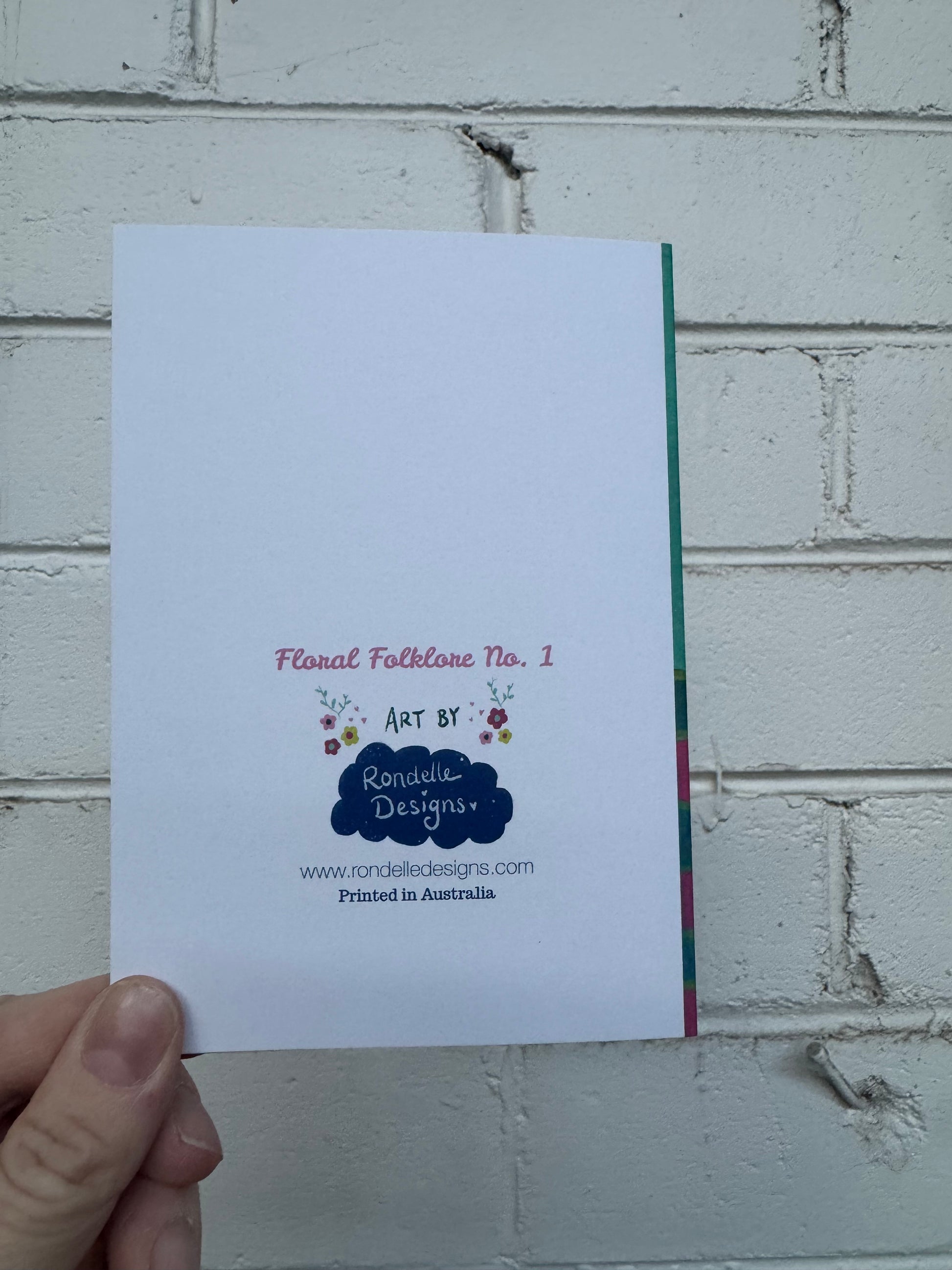 This beautiful and colourful A6 Size greeting card ‘Floral Folklore No.1’ is made in Australia using sustainable printing practices and includes a 100% Recycled Envelope.