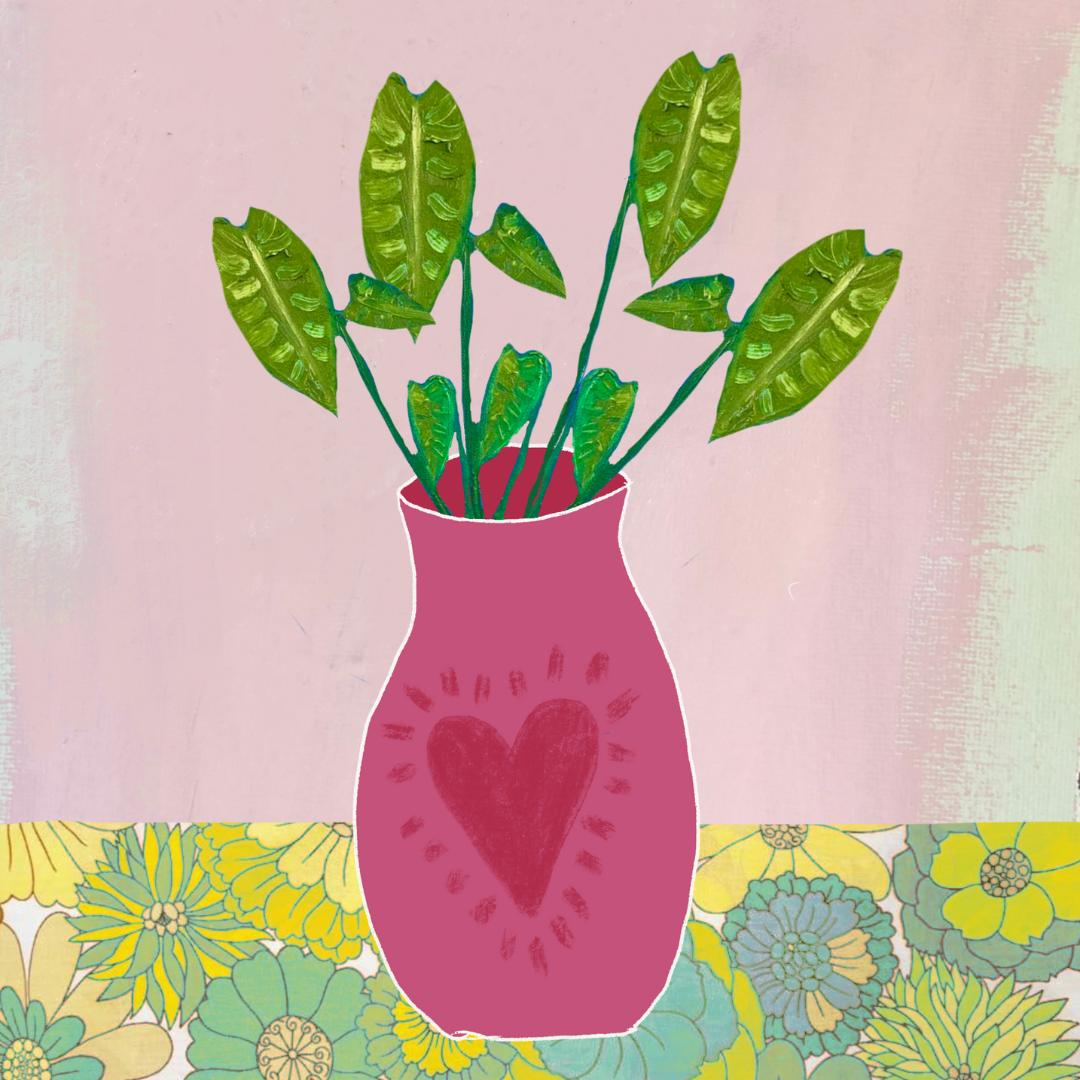 Bring art into everyday moments with this whimsical square art greeting card featuring Rondelle’s mixed media artwork “Heart Vase” This design is a mini piece of art ready to send and share.