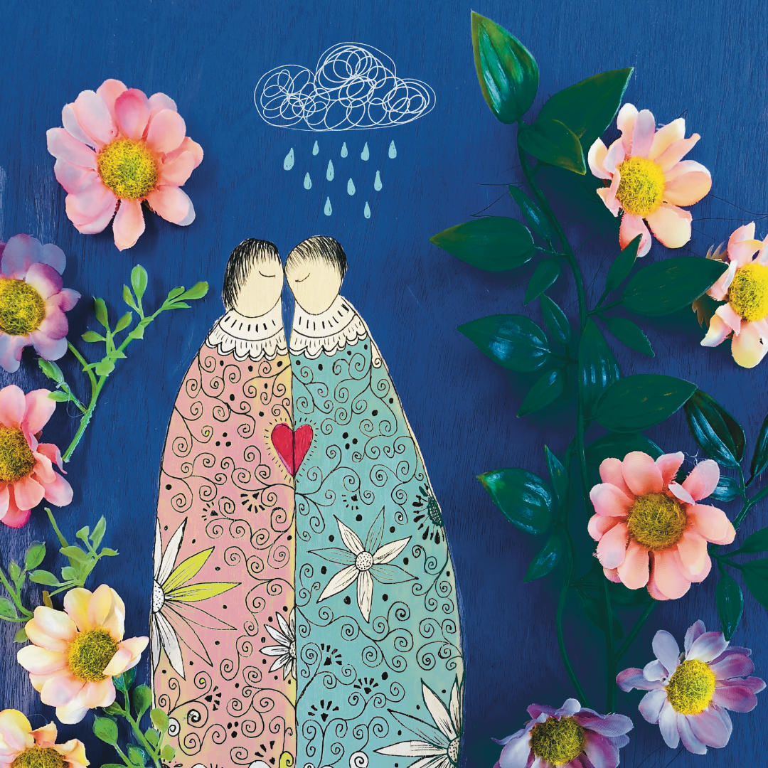 Bring art into everyday moments with this whimsical square art greeting card featuring Rondelle’s mixed media artwork “The Lovers” This design is a mini piece of art ready to send and share.
